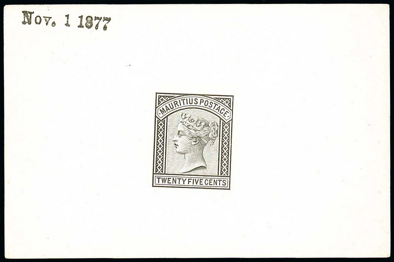 25c. die proof in black on glazed card (92x60mm.) dated "Nov. 1 1877", fine. Photo