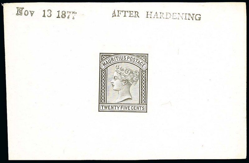 25c. die proof in black on glazed card (92x60mm.), marked "after hardening" and dated "Nov 13 1877", fine. Photo