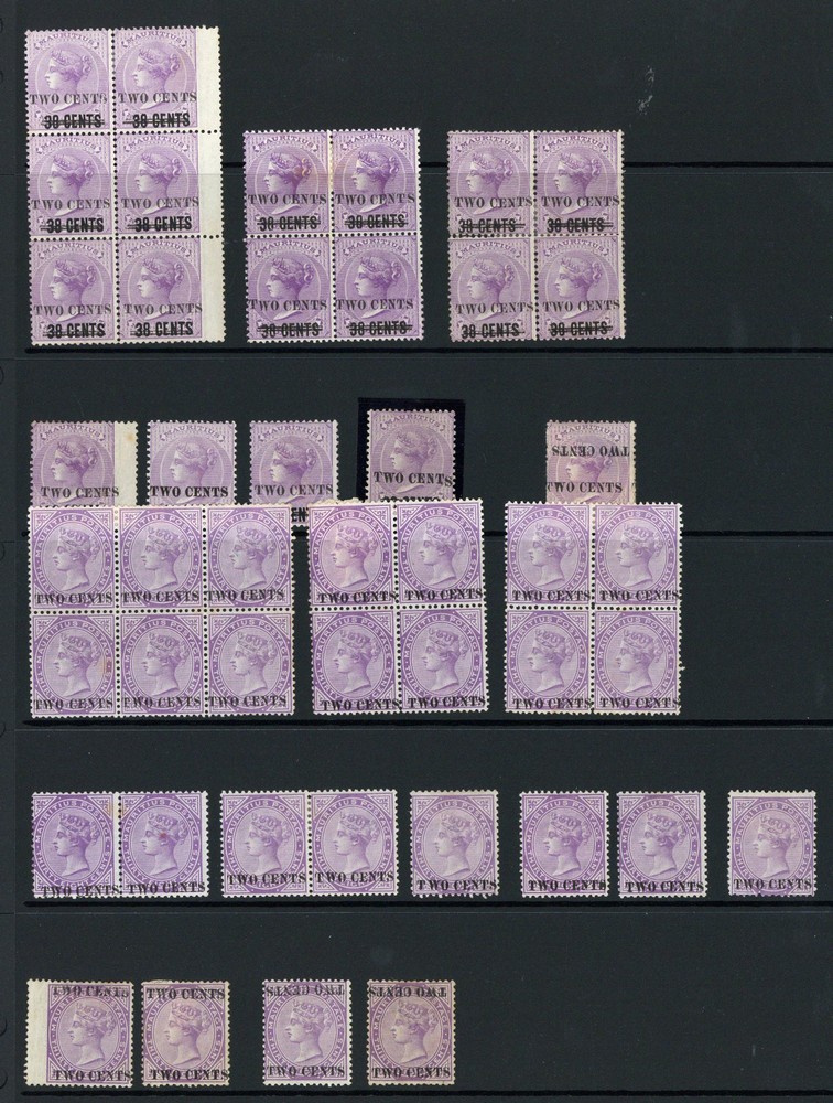A mint range comprising 2c. on 4c. blocks of four (2) and singles (10, two with surcharge inverted, five with surcharge double - one with BPA certificate, and one with surcharge double, one inverted); 2c. on 17c. (9); 2c. on 38c. on 9d. blocks of six and four (2), and singles (5, one with surcharge double, one inverted); and 2c. on 38c. blocks of six and four (2), pairs (2) and singles (8, two with surcharge double and two with surcharge double, one inverted), the varieties not guaranteed therefore the lot is sold "as is", mostly fine. S.G. 118-121, £3500+