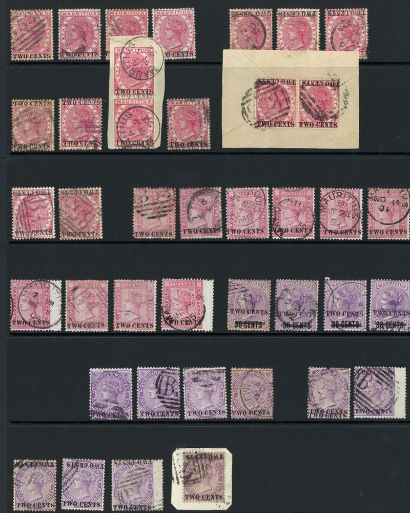 A used range comprising 2c. on 4c. (14 including three with surcharge inverted, five including a vertical pair on piece with surcharge double and a pair on piece with surcharge double, one inverted), 2c. on 17c. (10), 2c. on 38c. on 9d. (4) and 2c. on 38c. (10 including two with surcharge double and four with surcharge double, one inverted), the varieties not guaranteed therefore the lot is sold "as is", condition generally fine. S.G. 118-121, £4000+
