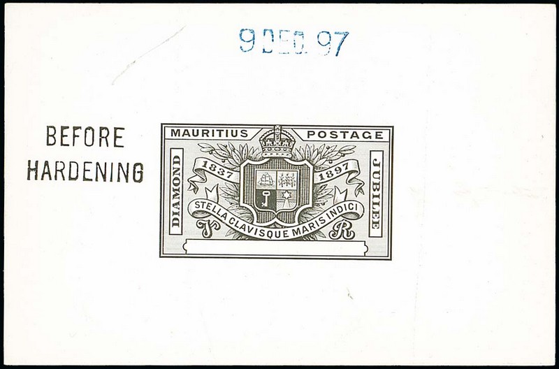 Complete design with blank value tablet in black on glazed card (92x60mm.), marked "before hardening" and dated "9 dec 97", fine. Photo