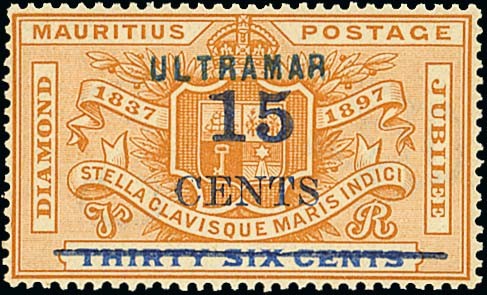 15c. on 36c. orange and ultramarine handstamped "ultramar" in blue, fine with large part original gum. rare in such fine condition. S.G. 135. Photo