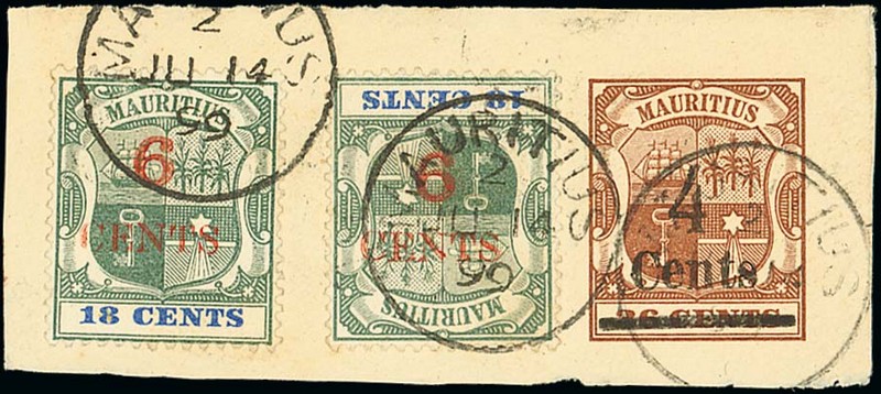6c. on 18c. green and ultramarine (2, one with variety surcharge inverted) on 1899 (14 June) 4c. on 36c. stationery envelope piece, all tied by Mauritius c.d.s., fine. R.P.S. Certificate (1941). S.G. 134a, £300. Photo
