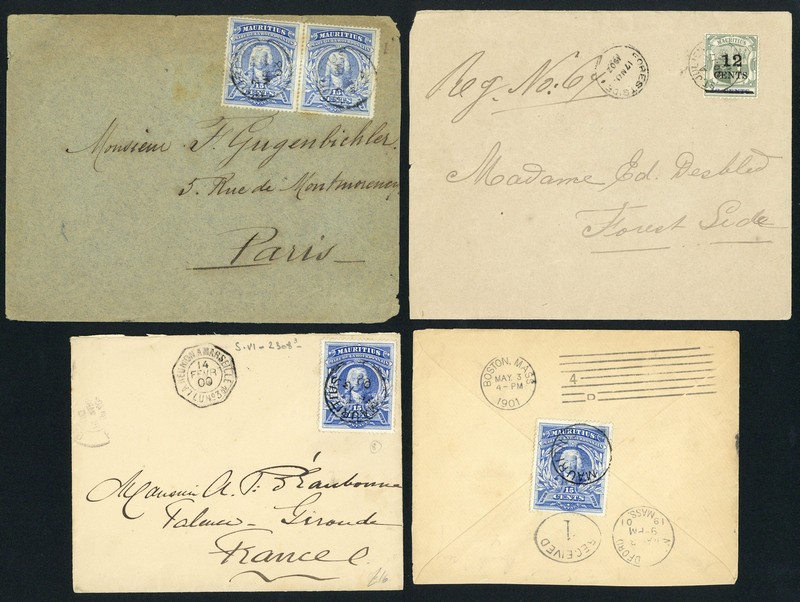 1900-03 envelopes (4) and a front addressed to France (3) and USA (2), two are double rate frankings; also 1902-05 envelopes (5, one registered) and a large piece addressed to France, UK and local (3), each bearing either 1902 12c. on 18c. or 1902 (Sept.) 12c. on 36c. Condition rather mixed