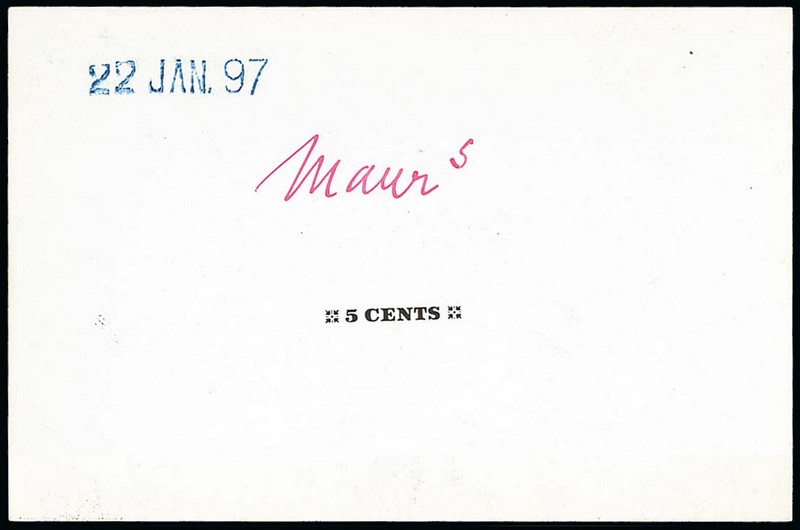 5c. value tablet with manuscript "Maurs" in red ink above, in black on glazed card (92x60mm.) dated "22 jan. 97", fine. Photo