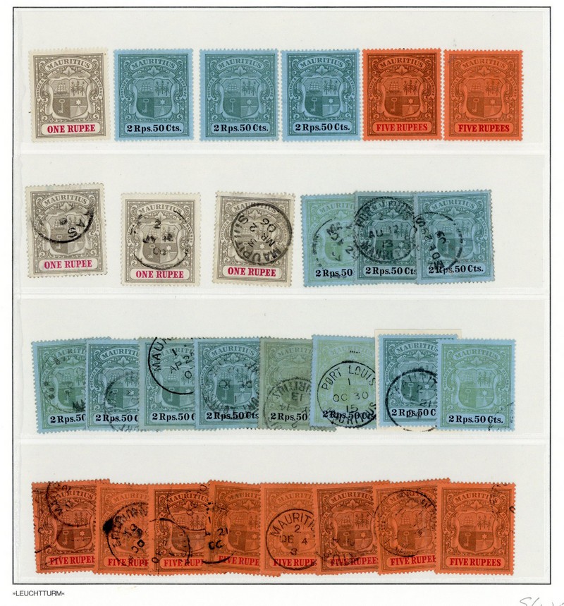 1c. to 5r. mint with additional 2c. corner block of thirty, 4c. black and carmine on blue, 15c. (3), 25c., 2r.50 (2) and 5r., plus used 5c. dull purple and bright purple (3), 8c. (green faded), 25c. (2, both washed), 1r. (3), 2r.50 (11, five discoloured) and 5r. (8); also 1895-99 1c. to 18c. less 6c. mint with additional 3c. block of twelve, 1c., 2c., 6c. (green washed) and 18c. strip of four and single (green washed) used. Condition generally fine. Cat. £4200+