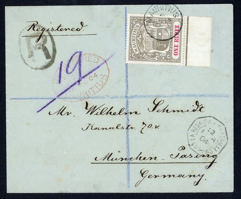 1904 (12 Feb.) envelope registered from Port Louis to Germany, bearing marginal 1r. tied by Mauritius c.d.s., showing "R" in oval, red "registered/mauritius" d.s., "la reunion a marseille/l.v. no 4" octagonal d.s. with arrival datestamp on reverse
