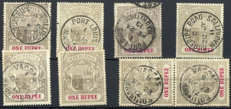 1r. grey-black and carmine vertical pair (creased) and singles (6), all but centrally cancelled with datestamp showing clear date, fine. S.G. 175, £480