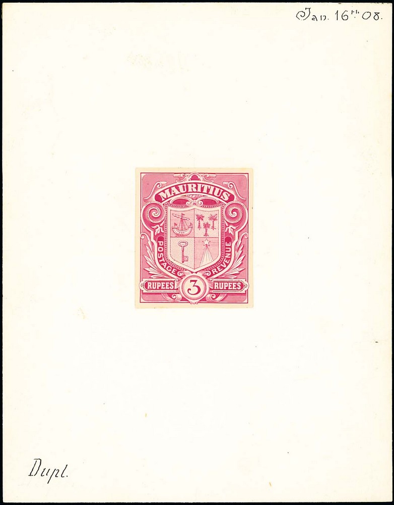 3r. in pink, attractive heavily engraved design of a large format with arms in centre, slightly touched-up by hand, affixed to card (90x115mm.) dated "Jan 16th 08". Photo