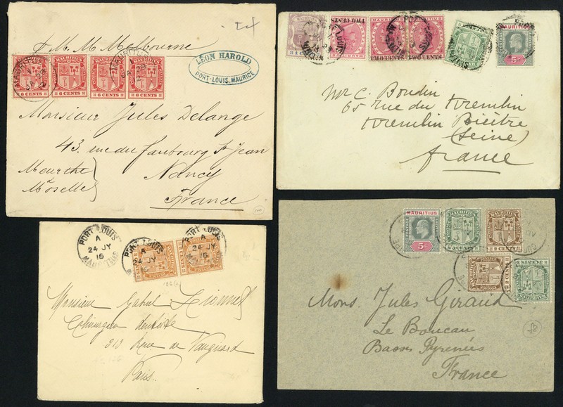 1910-17 envelopes (12, one registered) all addressed to France, showing frankings of 15c. (8), 16c., 24c. (2) and 27c., village cancellations include Curepipe (2) and Rose Hill; condition a little mixed