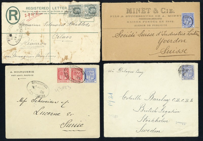 1911-21 envelopes (14, four registered), stationery registered envelope, wrapper and a piece addressed to Denmark, Germany (2), India (5), Reunion (2), Sweden, Switzerland and local, showing frankings of 2c., 3c. (stamp with perfins), 6c. (5), 12c., 15c. (3), 16c., 18c., 25c., 27c. and 36c., all with Mauritius or Port Louis datestamps; condition a little mixed