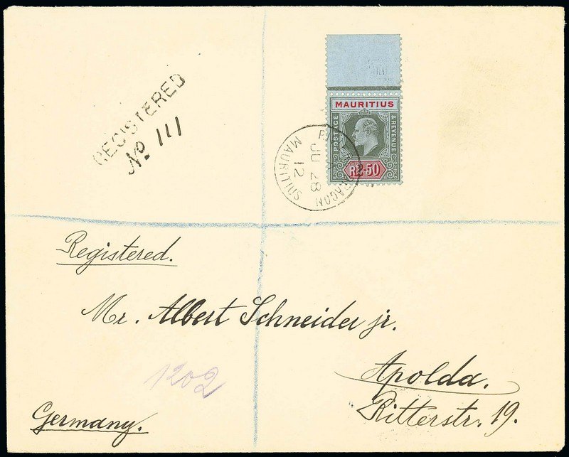 1912 (28 June) envelope registered to Germany, bearing 2r.50 (marginal) tied by "riviere dragon/mauritius" c.d.s. (Type D5), showing "registered no" h.s. (Type R1, over five months later than recorded) with arrival datestamp on reverse. S.G. 193. Photo