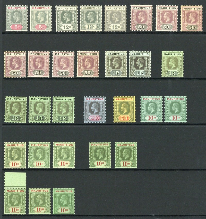 1913-22 MCA 5c. (2), 12c. (3), 50c. (7), 1r. (6), 2r.50, 5r. and 10r. (10, various papers and dies), and 1921-26 Script 1c. to 20c. set of seventeen, all mint, mostly fine. Cat. £1460+