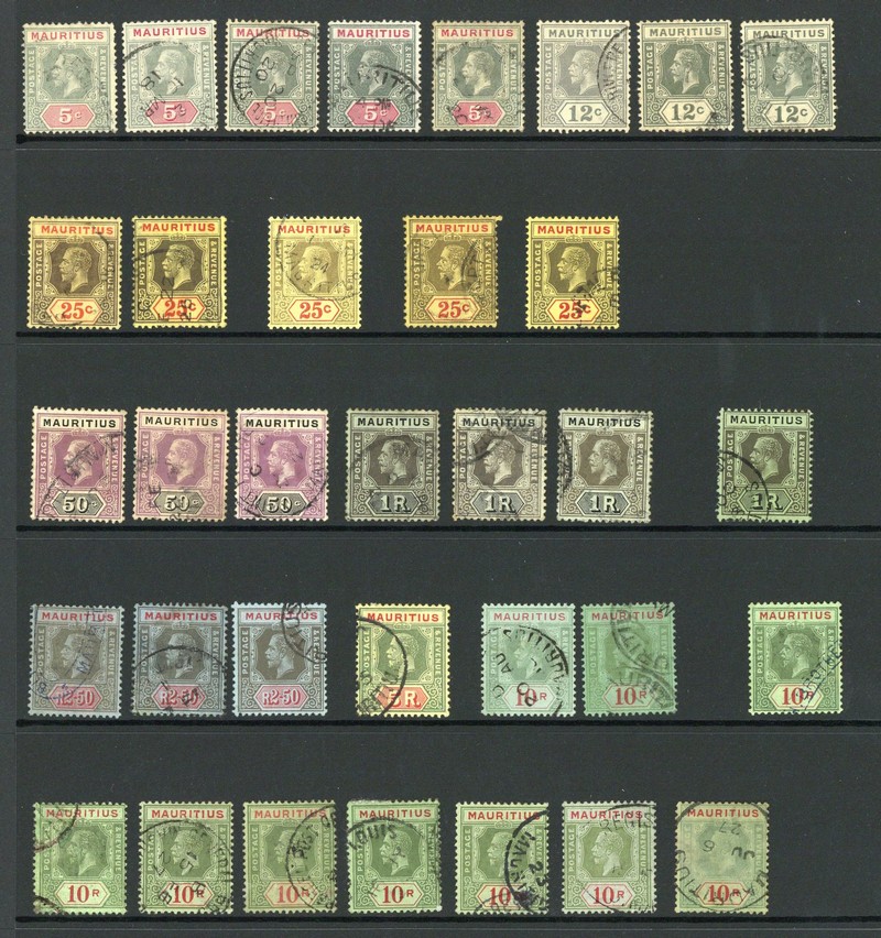 — 5c. (5), 12c. (3), 25c. (5), 50c. (3), 1r. (4), 2r.50 (3), 5r. and 10r. (10, one fiscally cancelled), and 1921-26 Script 1c. to 20c. set of seventeen, all used, generally fine. Cat. £2400+