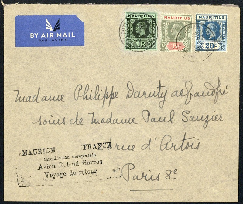 1937 (20 Jan.) Roland Garros return flight envelope from Mauritius to France, addressed to Paris, franked at 1r.25 and showing "maurice france/1ere Liaison aeropostale/Avion Roland Garros/Voyage de retour" cachet, fine