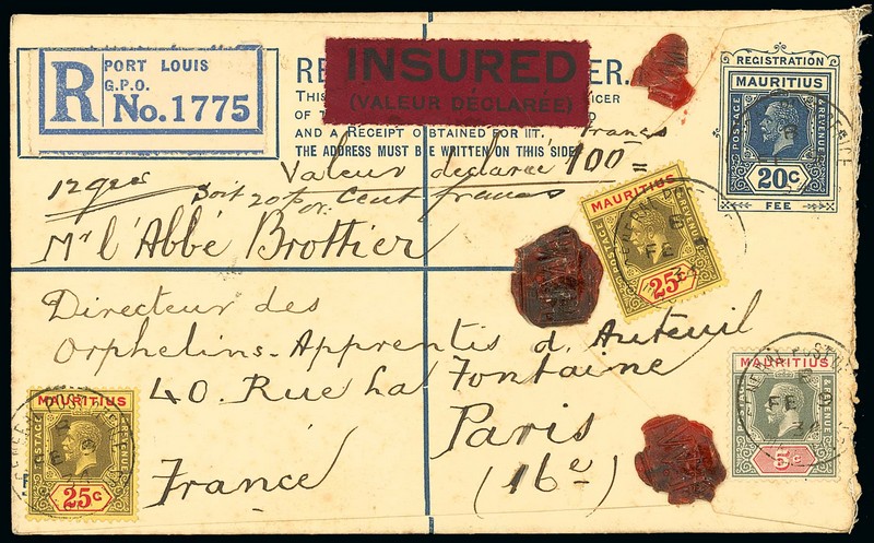 1922 (25 July) 15c. stationery envelope to Paris uprated 85c., marked "Insured for 600 francs" and "20 grammes"; 1934 (9 Feb.) 20c. registered envelope to Paris, uprated 55c., marked "valeur declaree 100 francs" and "12 grs" and showing black on red "insured" label; both envelopes with some faults. Very scarce. Photo