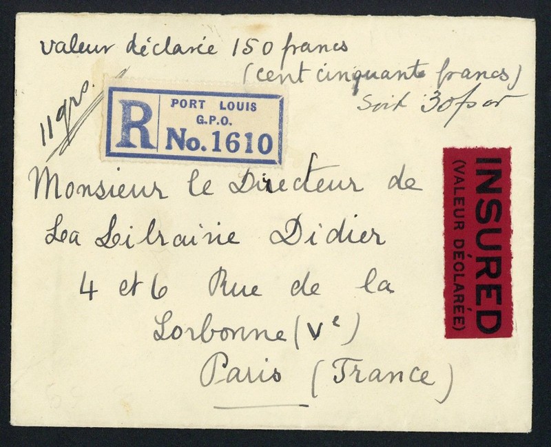 1933 (26 Aug.) envelope registered from Port Louis to Paris, marked "valeur déclaree 150 francs" and "11 grs", showing black on red "insured" label and bearing, on reverse, KGV 25c. (3) clearly tied by GPO datestamps. Very scarce