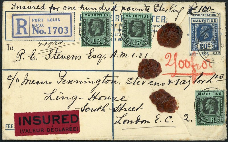 1933 (28 Nov.) 20c. registered envelope to London, uprated 3r.33, marked "Insured for one hundred pounds sterling" and "21 grs", and showing black on red "insured" label. Attractive. Very scarce. Photo