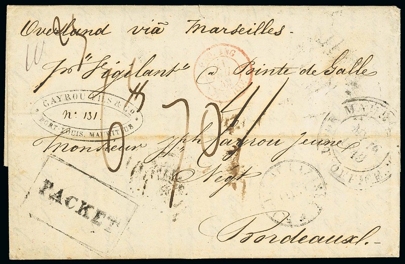 1849 (5 May) entire from Port Louis to Bordeaux, marked "Overland via Marseilles", variously rated, showing legible "mauritius/post office" double-ring d.s. (Type PS6; crossed by light horizontal filing crease), fine framed "packet" (Type SL2), "purifie au lazaret/malte" h.s., red Marseilles entry c.d.s. and, on reverse, "colombo/steamer letter" d.s. (4.6), Alexandria British PO transit c.d.s. (13.7) and arrival datestamp (24.7). A fine letter, full of character. Photo