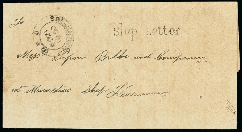 1850 (3 Oct.) "Pipon Bell" entire letter from Bombay to Port Louis, showing unframed "ship Letter" (Type SL11) and "g.p.o./mauritius" double-ring d.s. (21.11). A very early date of use. Photo