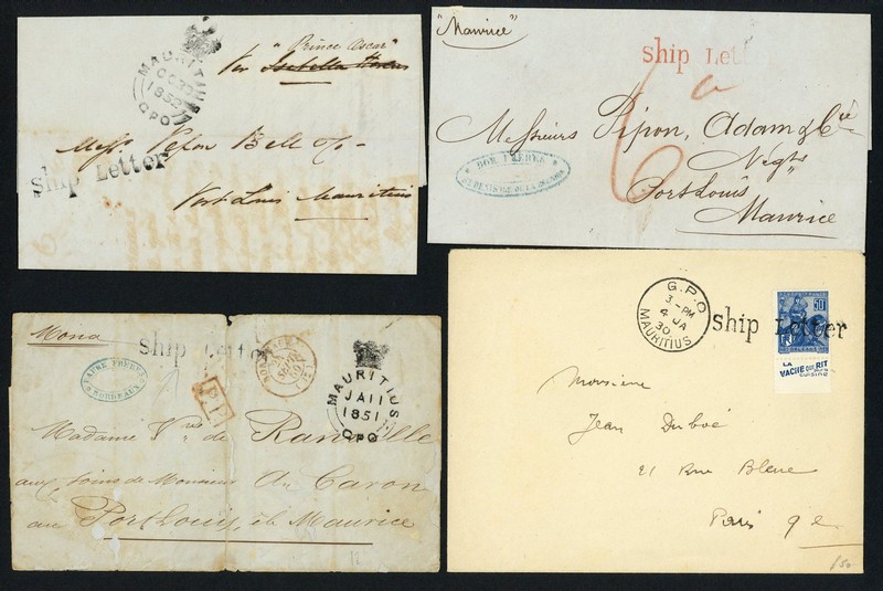 1851 entire (faults) from France and 1852 (30 Aug.) entire letter (some light discolouration) from Calcutta, both addressed to Port Louis showing Crowned Mauritius GPO d.s. (11.1 and 30.10 respectively) and unframed "ship Letter" h.s. (Type SL11) in black; 1863 (9 July) entire letter from Reunion to Port Louis, showing good to fine unframed "ship Letter" h.s. in red with arrival datestamp (15.7) on reverse; also 1930-92 envelopes (5) each with "ship Letter" h.s., one in red