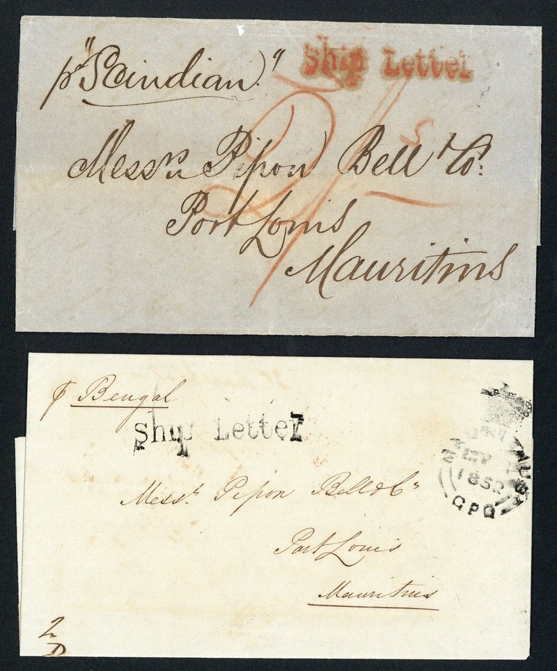 1852 (10 Mar.) "Pipon Bell" entire letter from Calcutta to Port Louis, marked "p Bengal", showing Crowned GPO Mauritius arrival d.s. (1.5) and unframed "ship Letter" h.s. in black; 1862 (20 May) "Pipon Bell" entire letter from Madras to Port Louis, rated "2/-" and showing oily strike of "ship letter" h.s. in red (scarce) with arrival datestamp (21.6) on reverse