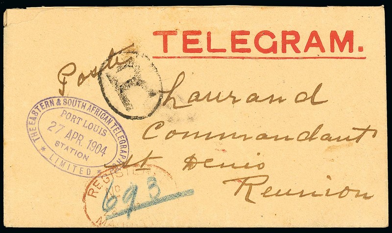 1904 (27 Apr.) "telegram" envelope (seal cut away on reverse) registered from The Eastern & South African Telegraph Co. to Reunion, franked at 27c., showing firm's violet datestamp and red registered d.s.; also 1903 (1 Aug.) "eastern telegraph company limited" printed envelope in vermilion registered to Reunion with stamp missing. Photo