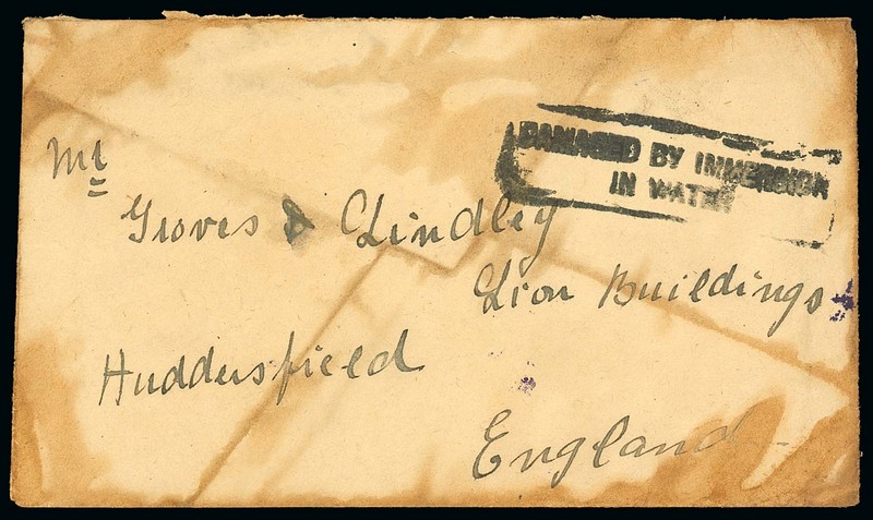 1918 (14 Apr.) envelope from Central Flacq to England, showing framed "damaged by immersion/in water" in black and bearing, on reverse, Arms 2c. (3) tied by Type D1 datestamp; some water staining. Photo