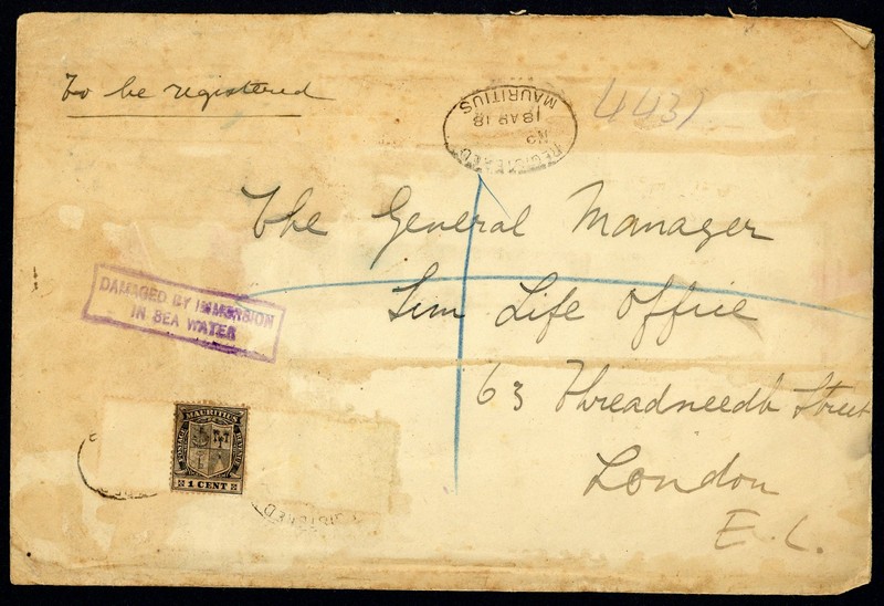 1918 (18 Apr.) envelope (228x152mmm.) registered to London, showing framed "damaged by immersion/in sea water" in violet; the envelope in a slightly distressed state and with three stamps missing