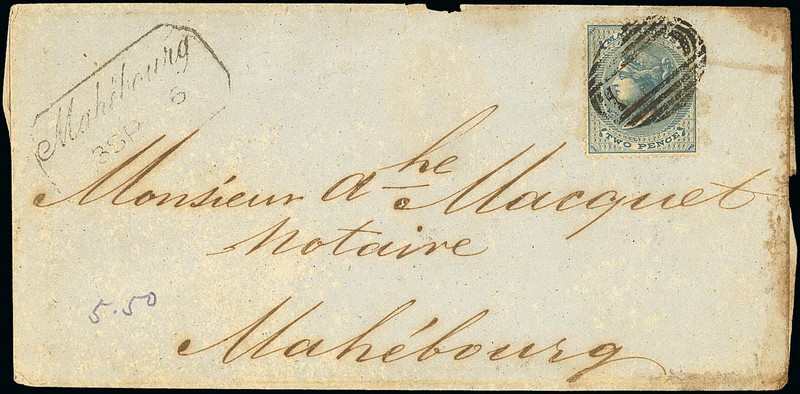 1860 (1 Sept.) envelope from Port Louis to Mahébourg, bearing 1860 2d. blue tied by dumb obliterator and showing fine "Mahébourg" arrival d.s. (Type D2) dated 3 September with despatch c.d.s. on reverse; the envelope with some peripheral staining, mainly at right. Rare. Photo
