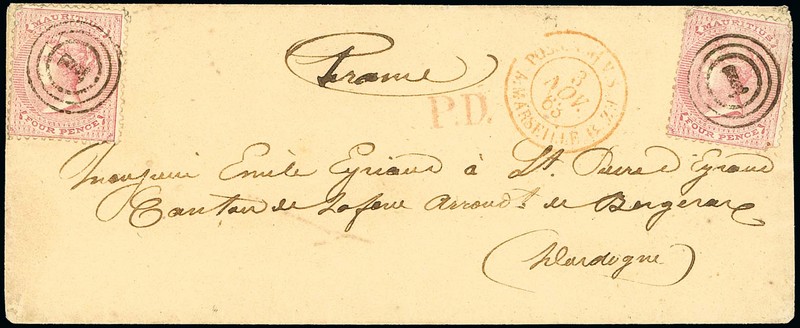 "1" (Type K1) centrally cancelling 1860 4d. rose (2) on 1863 (6 Oct.) envelope from Mahébourg to France, showing unframed "p.d." and French entry d.s. in red with, on reverse, despatch and various French transit and arrival datestamps. A late used of the no watermark issue stamps. Photo
