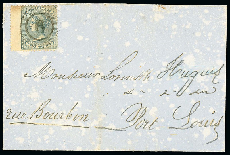 "6" (Type K2) centrally cancelled on 1860 2d. blue with wing-margin on 1862 (Sept.) entire from Poudre D'or to Port Louis showing, on reverse, unclear despatch and arrival datestamps; the stamp lightly stained and the entire heavily age-spotted and the addressee's name partly re-instated. Photo