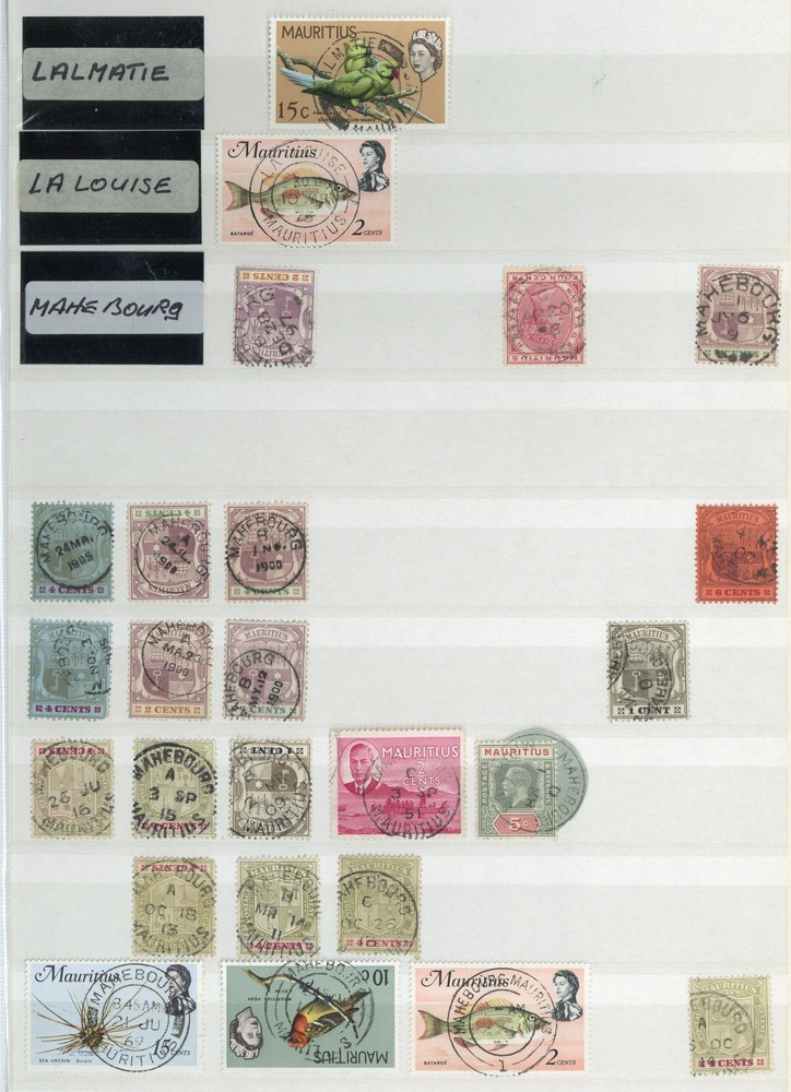 An extensive QV to QE collection in two stockbooks with over ninety different offices represented, comprising covers/cards (27) and stamps/pieces (1000+), including barred numerals, single and double-ring d.s., a few coloured, also some GPO/Port Louis datestamps. A good lot well worth examination