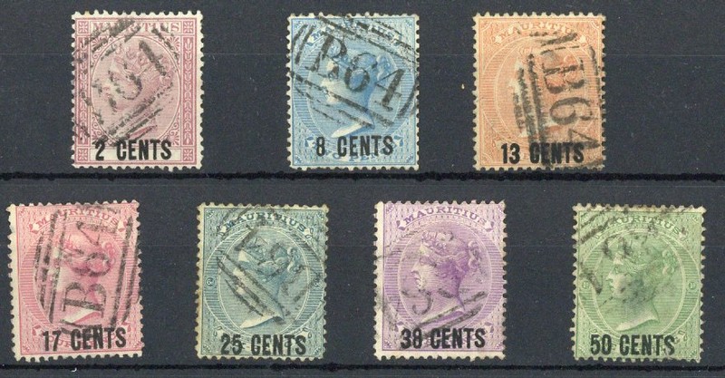 1878 2c., 8c. on 2d., 13c. on 3d., 17c. on 4d., 25c. on 6d., 38c. on 9d. and 50c. on 1/- (defects), fair to fine strikes. S.G. Z37-Z44 group, £1140