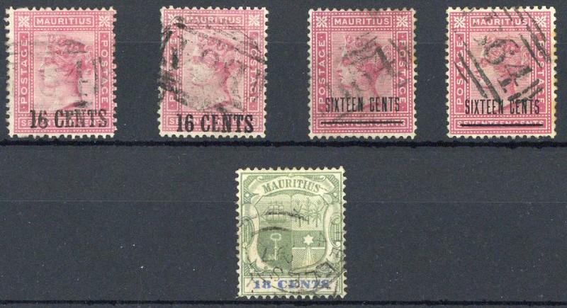 — "16 cents" on 17c. (2) and "sixteen cents" on 17c. (2, small faults), good strikes. Also 1897 18c. with Seychelles c.d.s. S.G. Z62, Z63, £336+