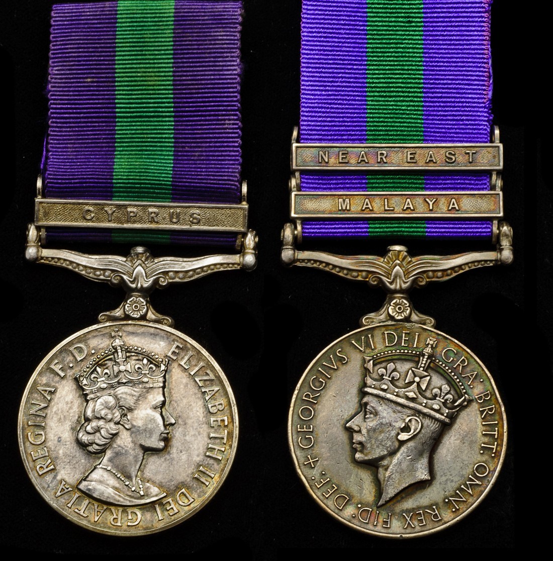 General Service 1918-62 (2), E.II.R., one clasp, Cyprus (23455263 Pte. J. Cannacott. R.W.K.); G.VI.R., two clasps, Malaya, Near East (22856754. Pte. N.S. Clarke. R.W.K.), edge bruising, nearly very fine, the first good very fine (2)
