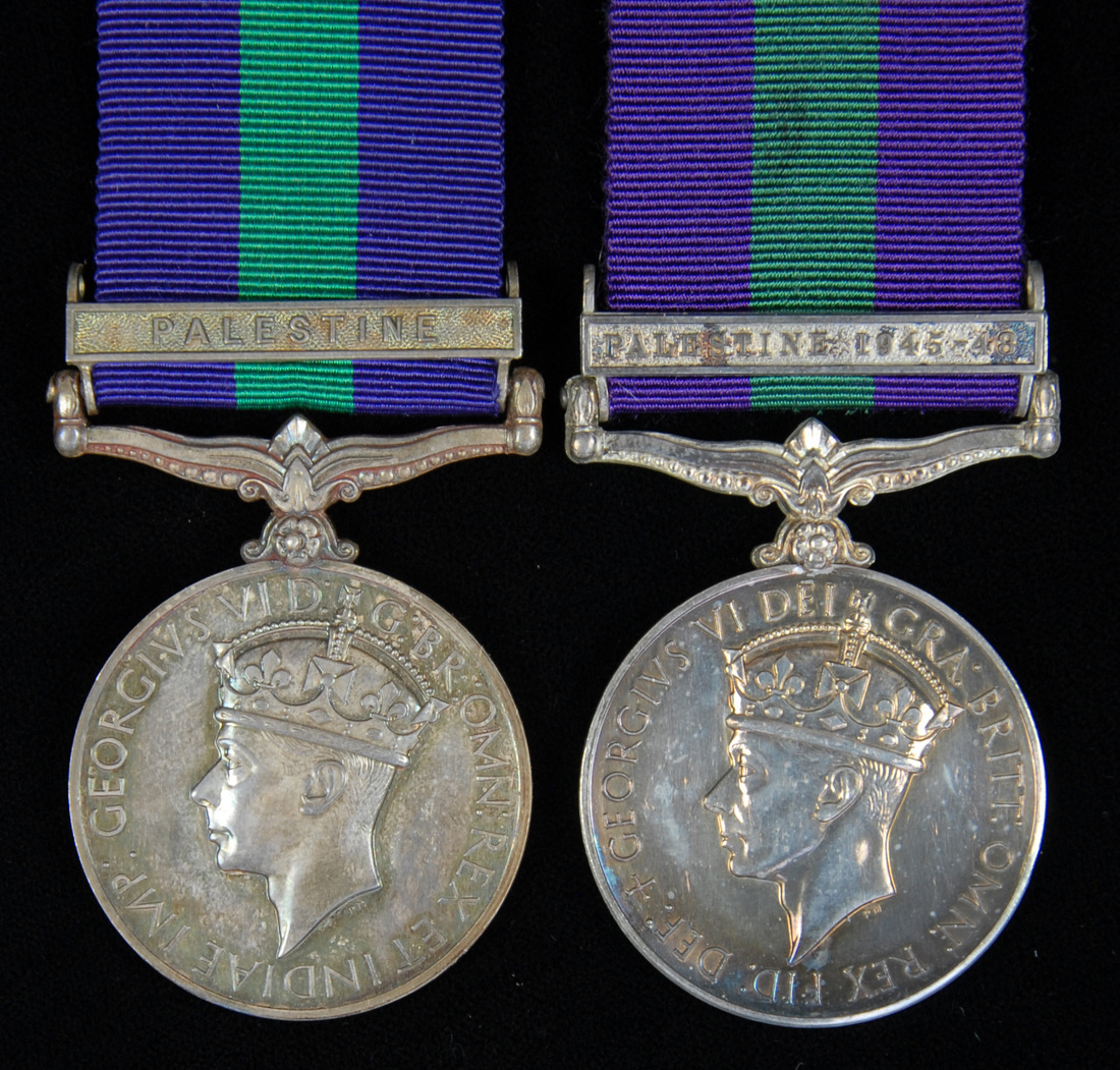 General Service 1918-62, G.VI.R., one clasp (2), Palestine (2322377. Sgln. E.H. Long. R. Signals.); Palestine 1945-48 (1069560 W.O. Cl.1. E.J. Mills. R.E.M.E.), nearly extremely fine (2)