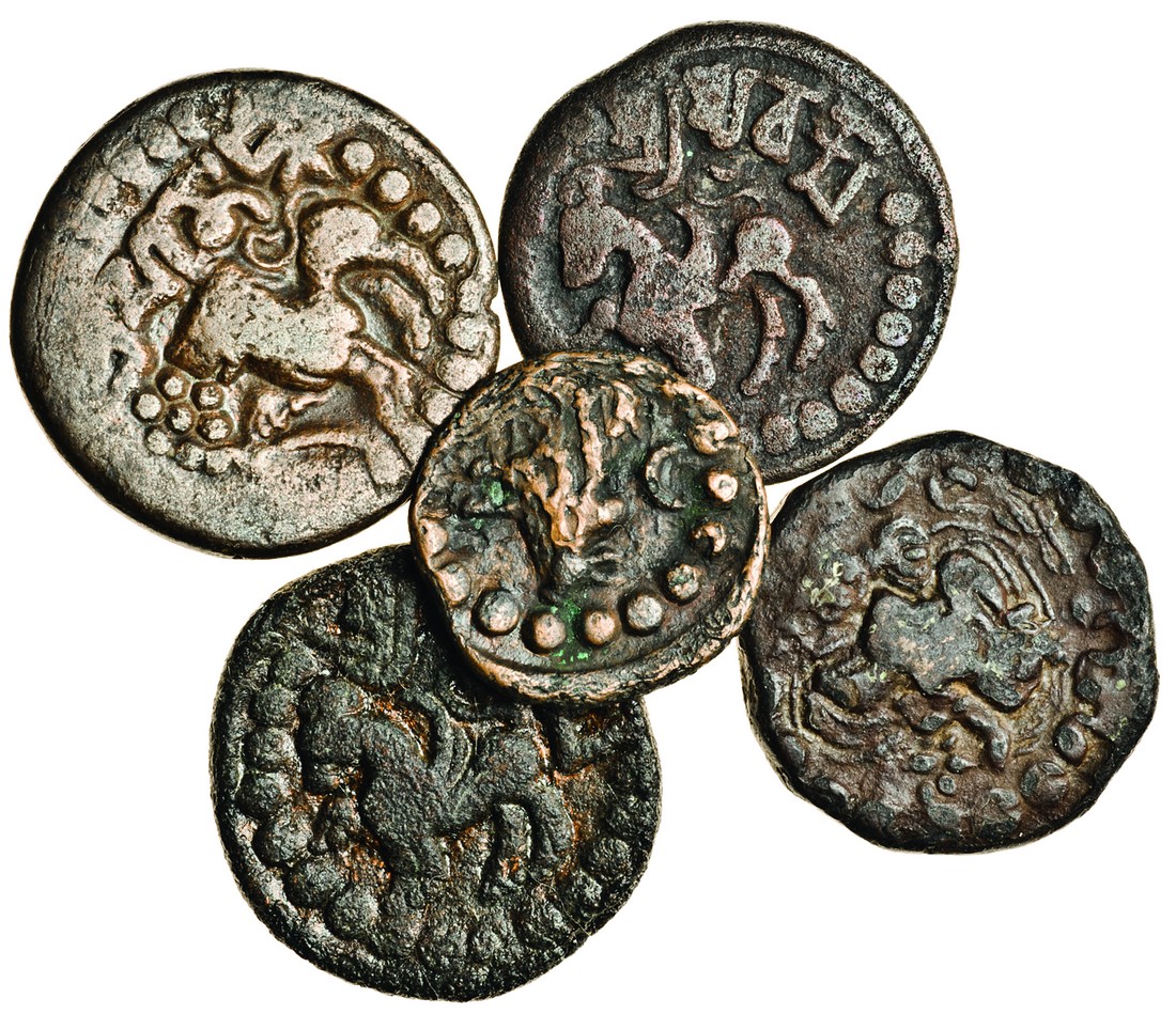 Nepal, Lichhavi Period (c.576-750), AE Unit, standing lion, legend Sri Mananka above, rev. goddess seated on a lotus, Sri Bhogini above, AE Units (2), winged lion, Sryamsuvarma above, rev. lion with crescent above, AE Unit, bull standing right, rev. legend pasupatih around sun, AE Unit, deity Kuvera seated, rev. vase of flowers with legend pasupati in two lines either side (RGV. types 8-12, 21-24, 104-105, 136), about fine to very fine for type, scarce (5)