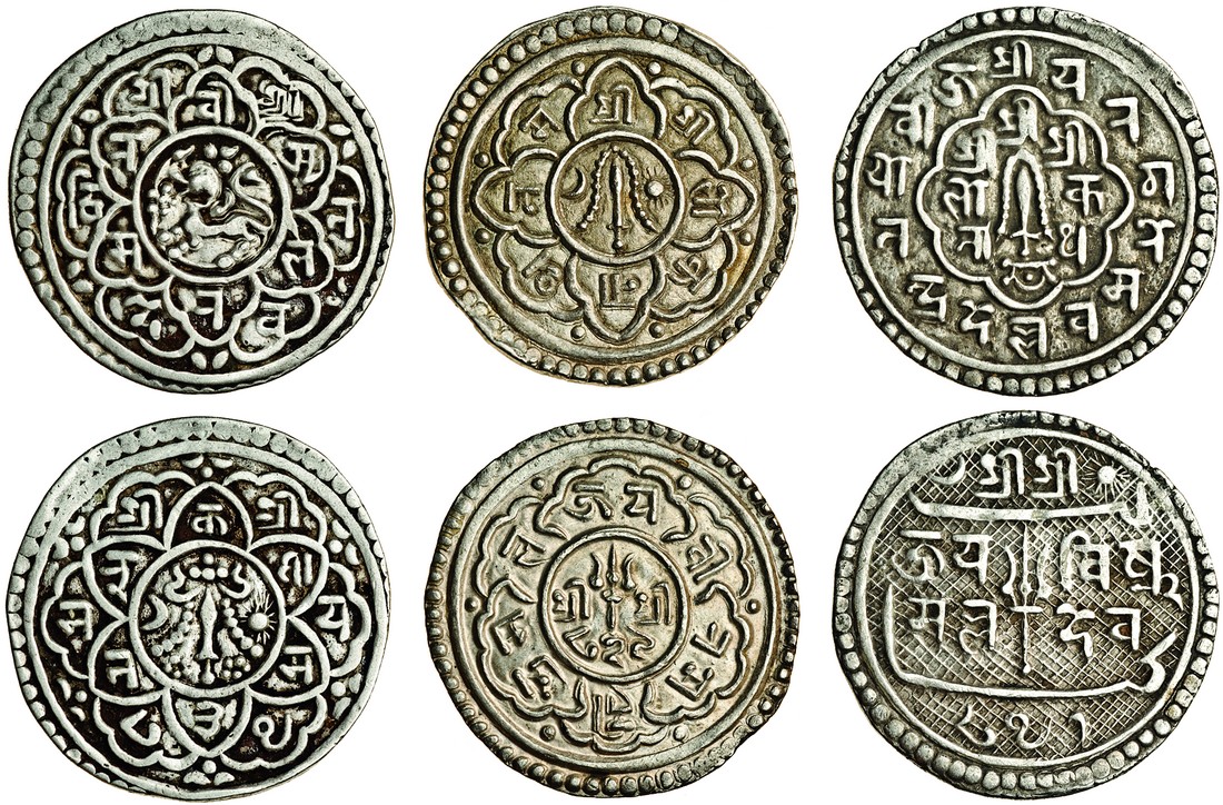 Nepal, Patan, Jaya Vira Mahindra Malla (1709-15), Mohar, NS 829 (1709), trident with date below within central circle, legend around naming Vira Mahindra, rev. garlanded sword with legend around within lotus petal frame (RGV.443; KM.370), good extremely fine; Riddhi Narasimha Malla (1715-17), Mohar, NS 835 (1715), lion within central circle, legend around within petals naming Riddhi Narasimha, rev. similar design with garlanded sword in centre, date in petals below (RGV.447; KM.375), about very fine; Jaya Vishnu Malla (1729-45), Mohar, NS 851 (1731), trident between pseudo-Persian letters on a cross-hatched background, legend naming Jaya Vishnu Malla with date below, rev. garlanded sword in scalloped frame, legend around naming Vira Yoga Narendra Malla (RGV.469; KM.400), very fine (3)