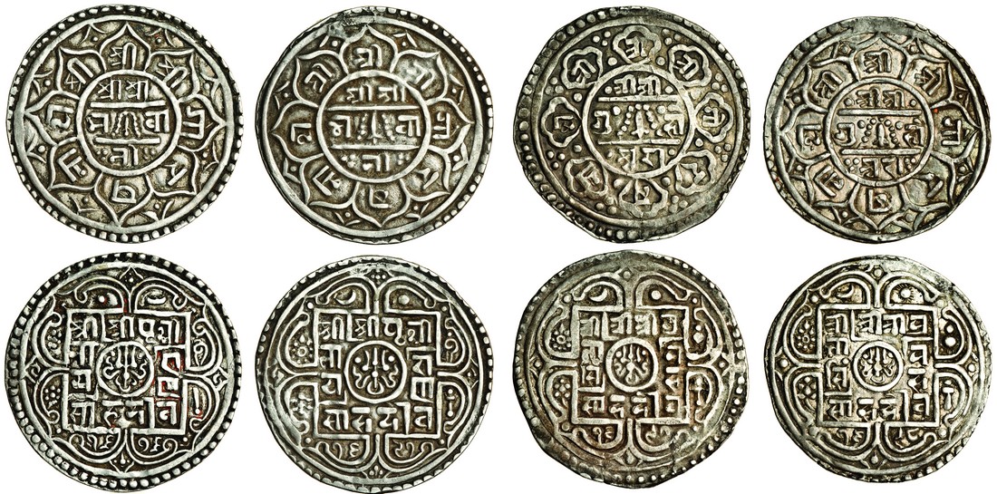 Nepal, Shah Dynasty, Prithvi Narayan (1742-75), Mohars (2), SE 1676, 1691 (1754, 1769), square panel containing legend with date below, rev. legend in eight-petalled flower, garlanded sword at centre (RGV.587, 611; KM.454), well struck examples, very fine to good very fine; Pratap Simha (1775-77), Mohars (2), SE 1697, 1698 (1775, 1776), square panel containing legend with date below, rev. legend in eight-petalled flower, garlanded sword at centre (RGV.640, 641; KM.472.1, 472.2), the first in debased metal for export to Tibet, good fine and very fine (4)