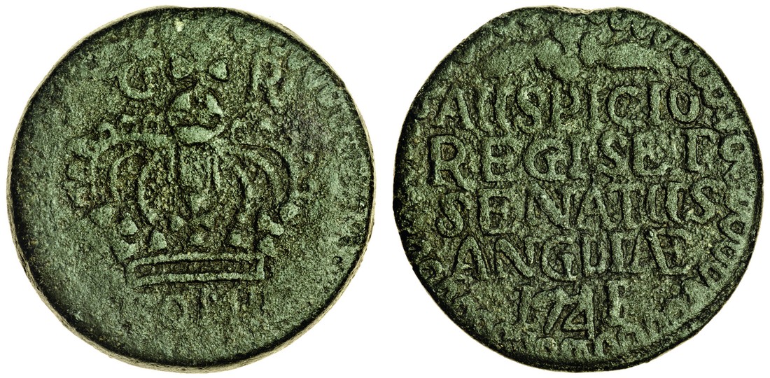 East India Company, Bombay Presidency, Tin Double-Pice, 1741, crown with g r above and bomb below, rev. auspicio regiset senatus angliae (Pr.233; KM.157), fine