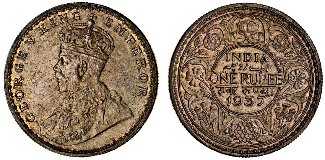 British India, AE Mule Rupee, 1937, Calcutta, by Patrick Brindley, bust of George V facing left, george v king emperor, rev. denomination in Urdu and Hindi, between English legend, in wreath of rose, thistle, shamrock and lotus (cf. Stevens & Weir 8.9) surface of obverse with small specks, otherwise uncirculated as struck with some lustre