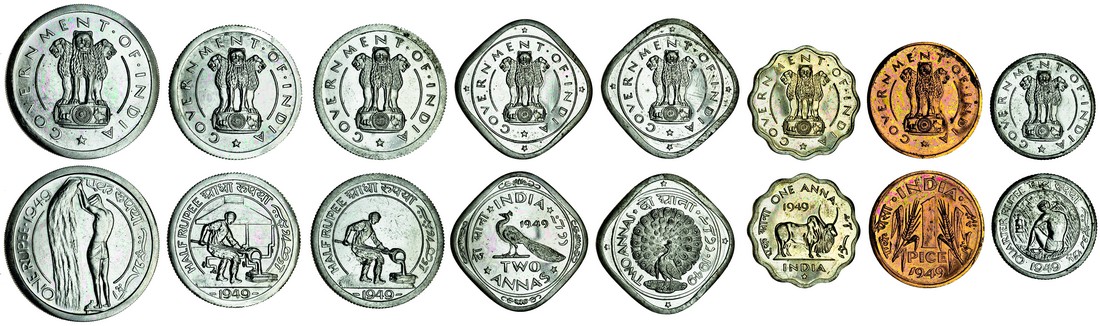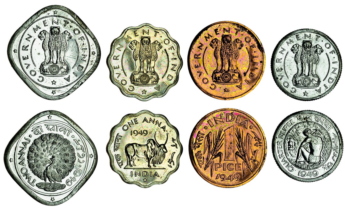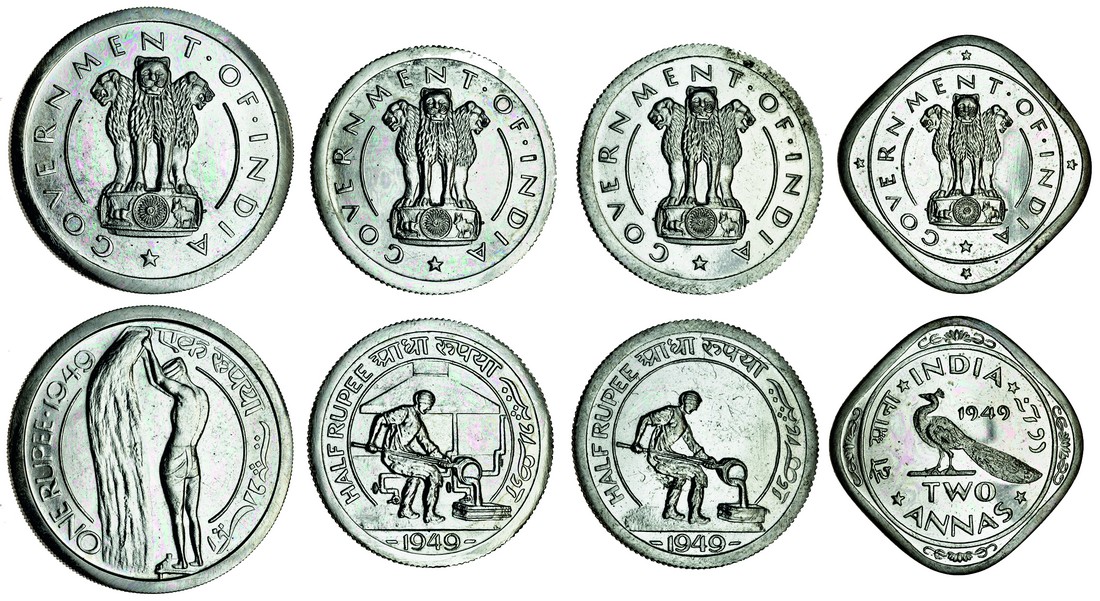 India, Republic, 8-Coin Proof Pattern Set, 1949, by Patrick Brindley, Cu. Ni. Rupee, obv. the lion capital of Asoka with government of india around, rev. man winnowing wheat, ½-Rupee (2), metal-worker pouring molten metal, with foundry building behind and plain background, ¼-Rupee, rev. miner seated left holding pick, 2-Annas (2), peacock facing with tail extended, peacock facing left, Anna, rev. water buffalo standing right, AE Pice, rev. two sheaves of wheat, some with minor handling marks, the Pice with a small obverse stain, otherwise as struck, an extremely rare and historically important set (8)