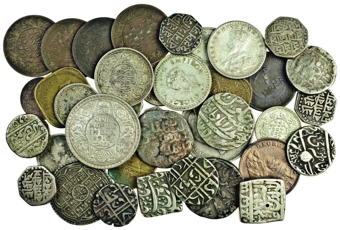 India, Miscellaneous, (37), including punch-marked Karshapana, Sultanate (2), Mughal (3), including Akbar, square Rupee, Bangala, (KM.86.1), Assam (5), Cooch Bihar (2), Kashmir, Nepal, other states (3); British India, Rupees (2), Half-Rupees (4), Quarter-Rupees (3), others (10), fine to very fine (37)