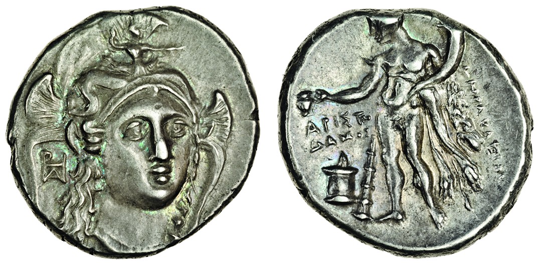 Lucania, Herakleia (c.281-278 BC), AR Stater (7.85g), head of Athena three-quarters facing right, wearing triple-crested helmet ornamented with Skylla hurling rock, monogram to left, rev. hpakein, Herakles standing left, club resting against leg, holding cup over altar in right hand, and lion’s skin and cornucopia in left, apito/amo on left (Van Keuren 93; Hist. Num. 1391), toned, rare, extremely fine