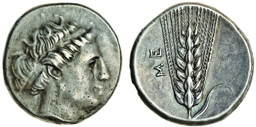 Lucania, Metapontum (c.400-350 BC), AR Stater, 7.88g, head of Demeter right, rev. ear of barley, me to left (Noe 501/2), toned, good very fine