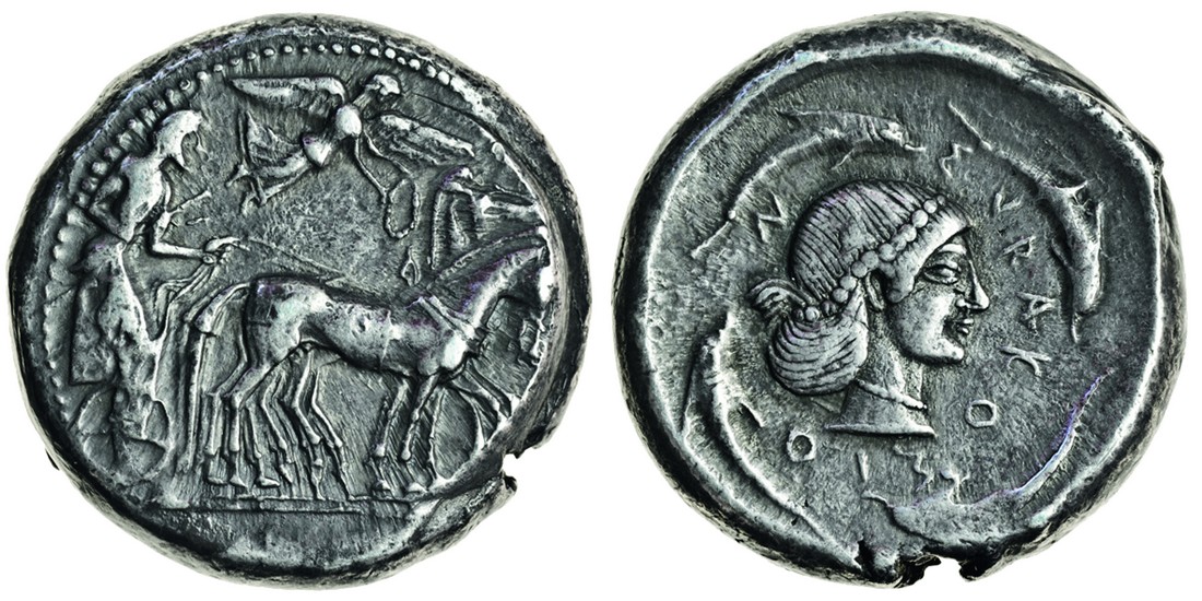 Sicily, Syracuse (c.485-466 BC), the Deinomenid Tyranny, AR Tetradrachm, 17.23g, charioteer driving slow quadriga right, Nike flying right above to crown horses with wreath, rev. ypakoion, head of Arethusa right, hair bound with band of pearls, four dolphins swimming around (Boehringer 205, V191/R141), old tone, a charming small head of Arethusa, very fine