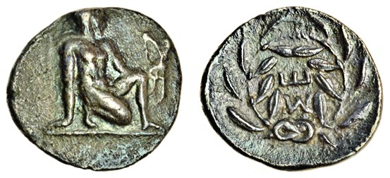 Peloponnese, Sikyon (400-350 BC), AR Tritartemorion, 0.57g, Apollo kneeling right, holding bow and arrows, rev. e within wreath (BCD Peloponnesos 270, 1; HGC 5, 231), toned, porous, good very fine
