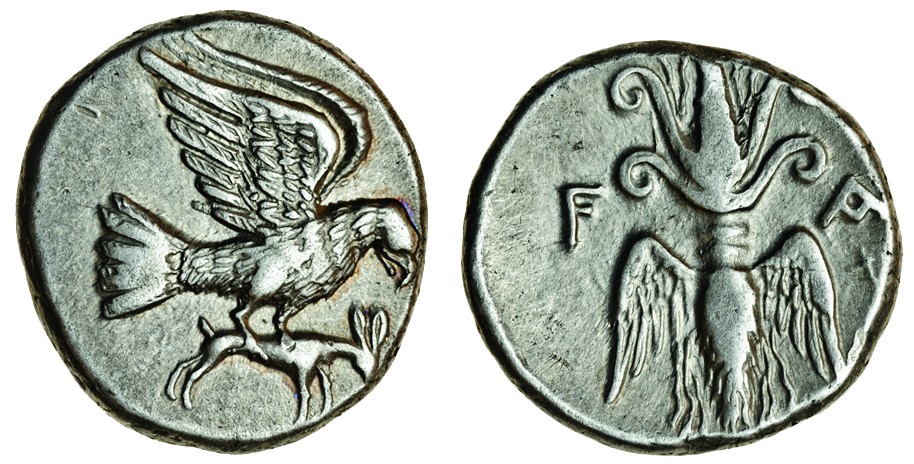 Elis, Olympia (c.245-210 BC), AR Drachm, 4.75g, eagle flying right, hare in talons, rev. winged thunderbolt dividing f-a (BCD 235; cf BMC 135), very fine