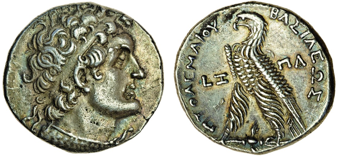 Kingdom of Egypt, Ptolemy VI (180-145 BC), AR Tetradrachm, 14.10g, Paphos, 164/163 BC, diademed head of Ptolemy I right, aegis round neck, rev. eagle standing left on thunderbolt, between date (year 7), and a (Svoronos pl.49, 1-2; SNG Copenhagen - ), toned, almost extremely fine